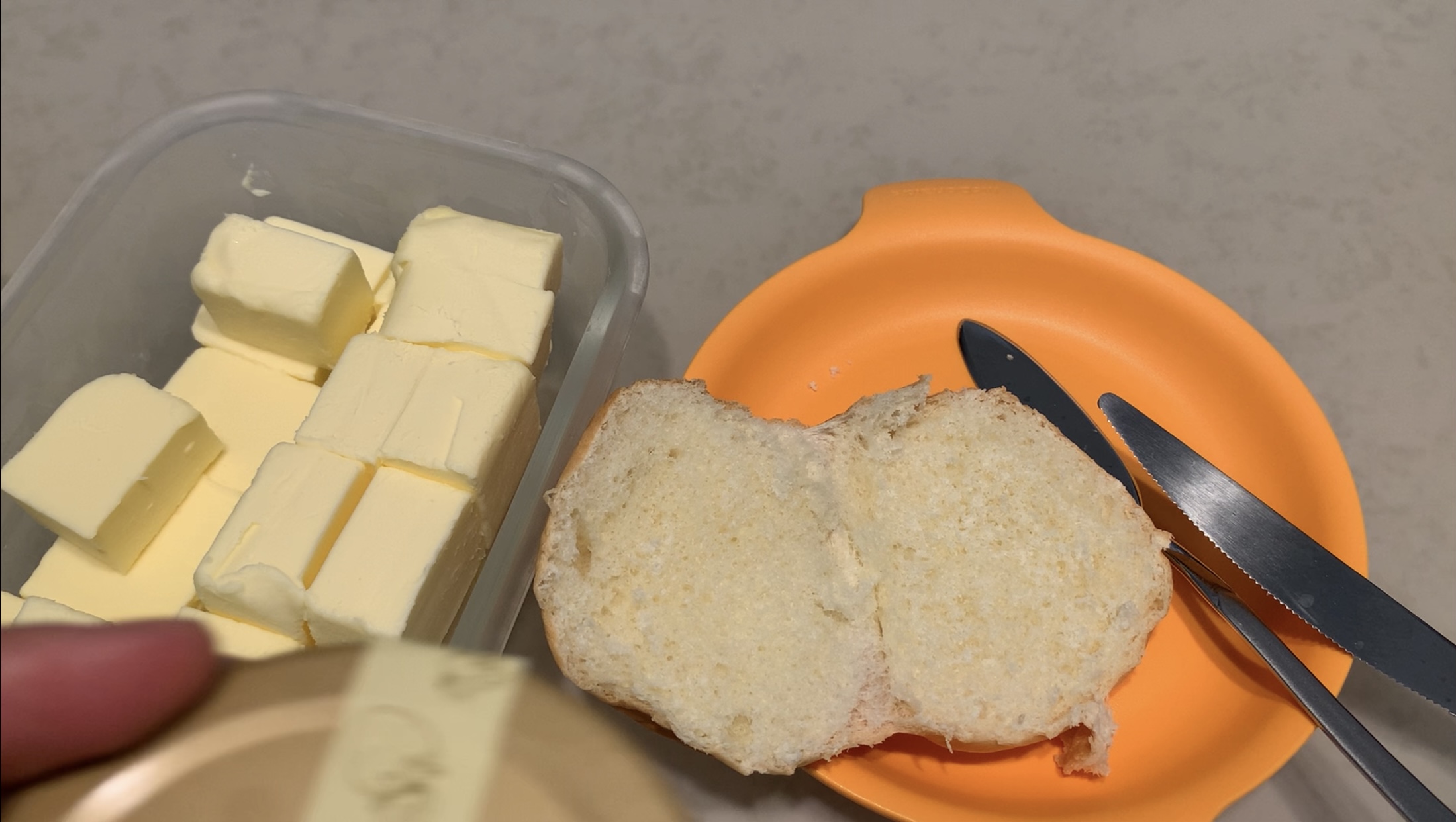 버터롤 빵을 반을 갈라주세요