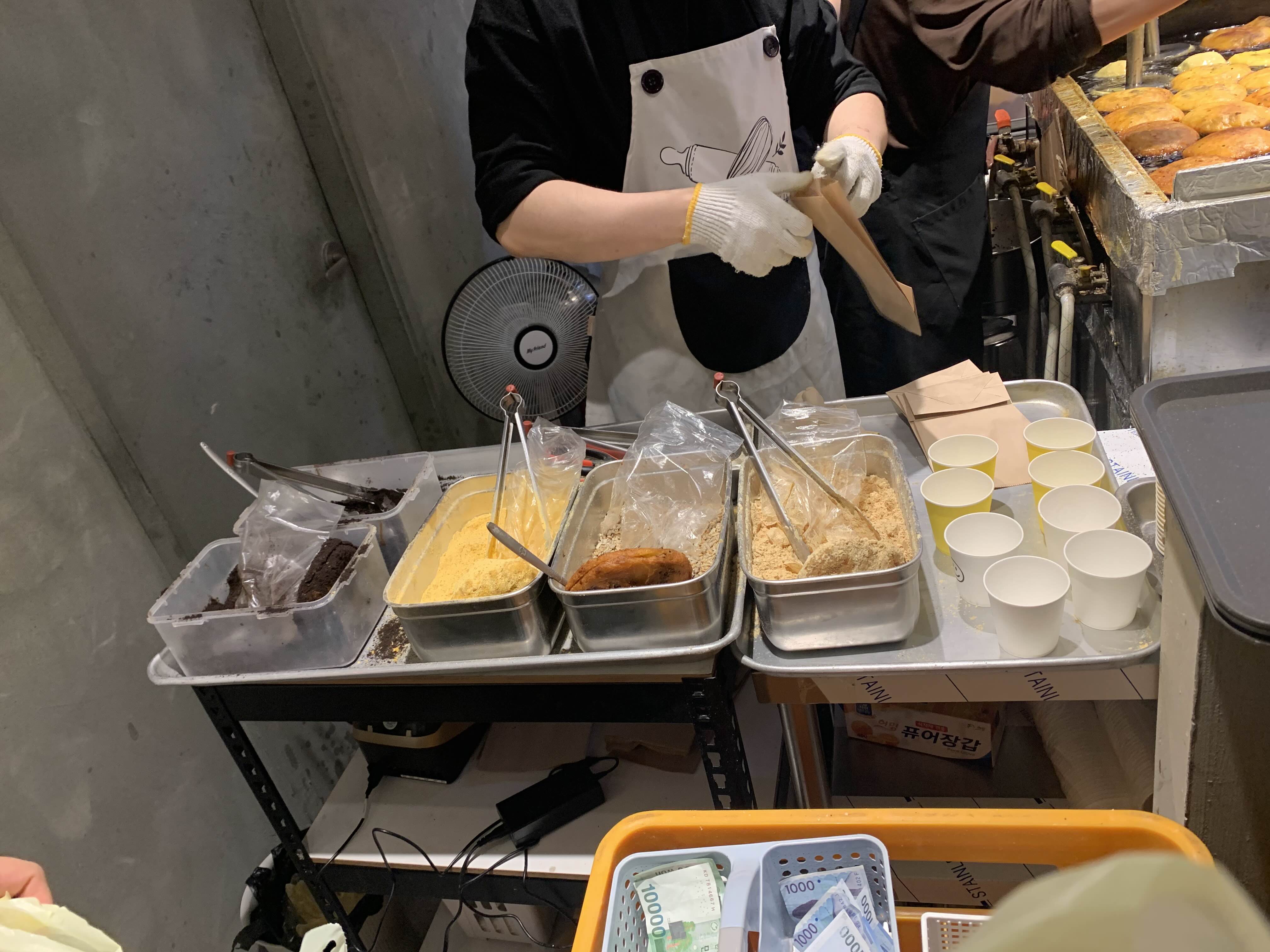왼쪽부터 오레오, 뿌링클, 씨앗, 인절미(콩가루) 순의 가루가 준비되어있고 기름범벅 호떡을 저 가루에 풍덩 담궈서 줍니다 ㅋㅋ