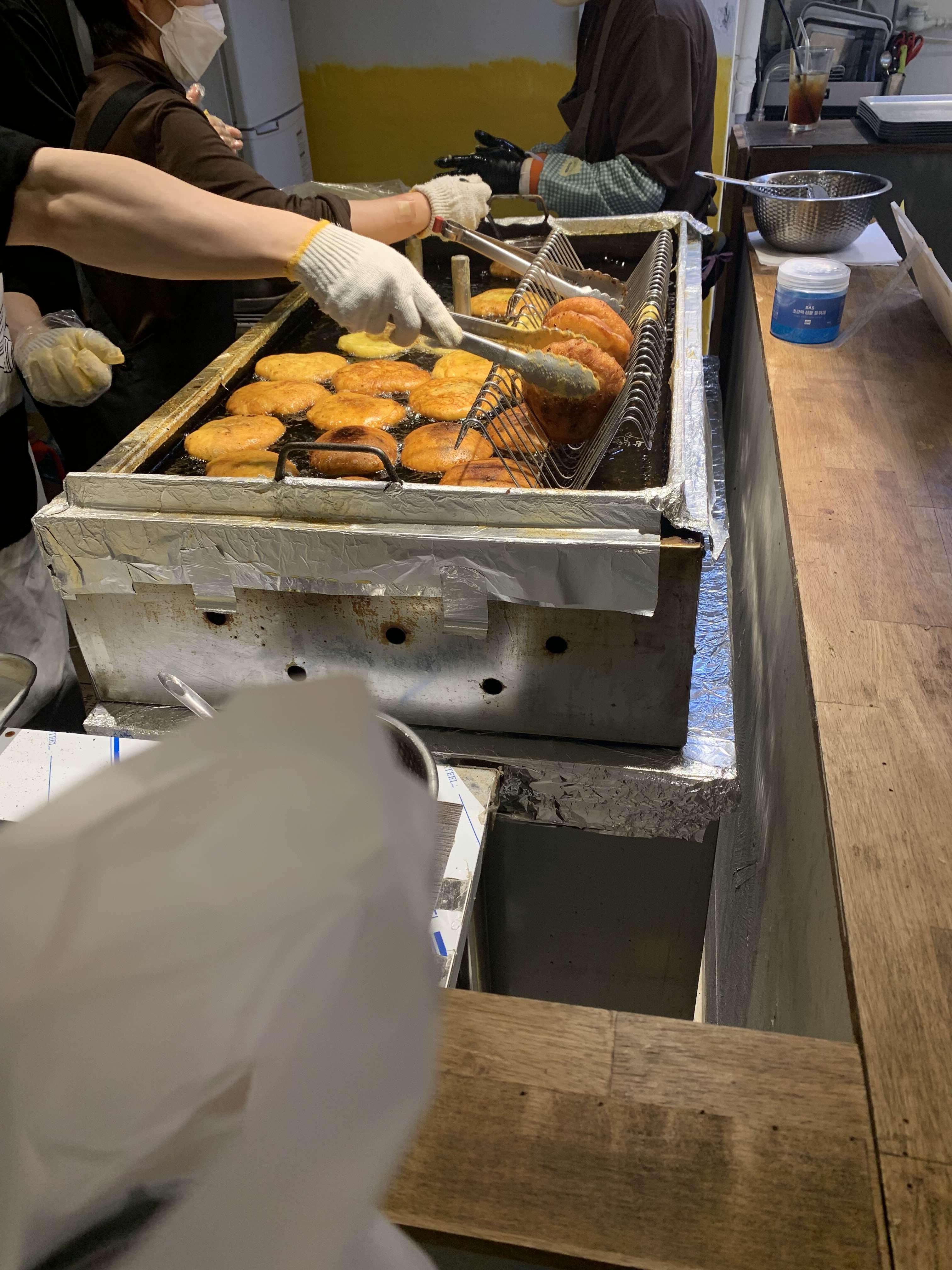 이렇게 호떡을 아예 기름에 튀기는 식으로 굽더라구요..
